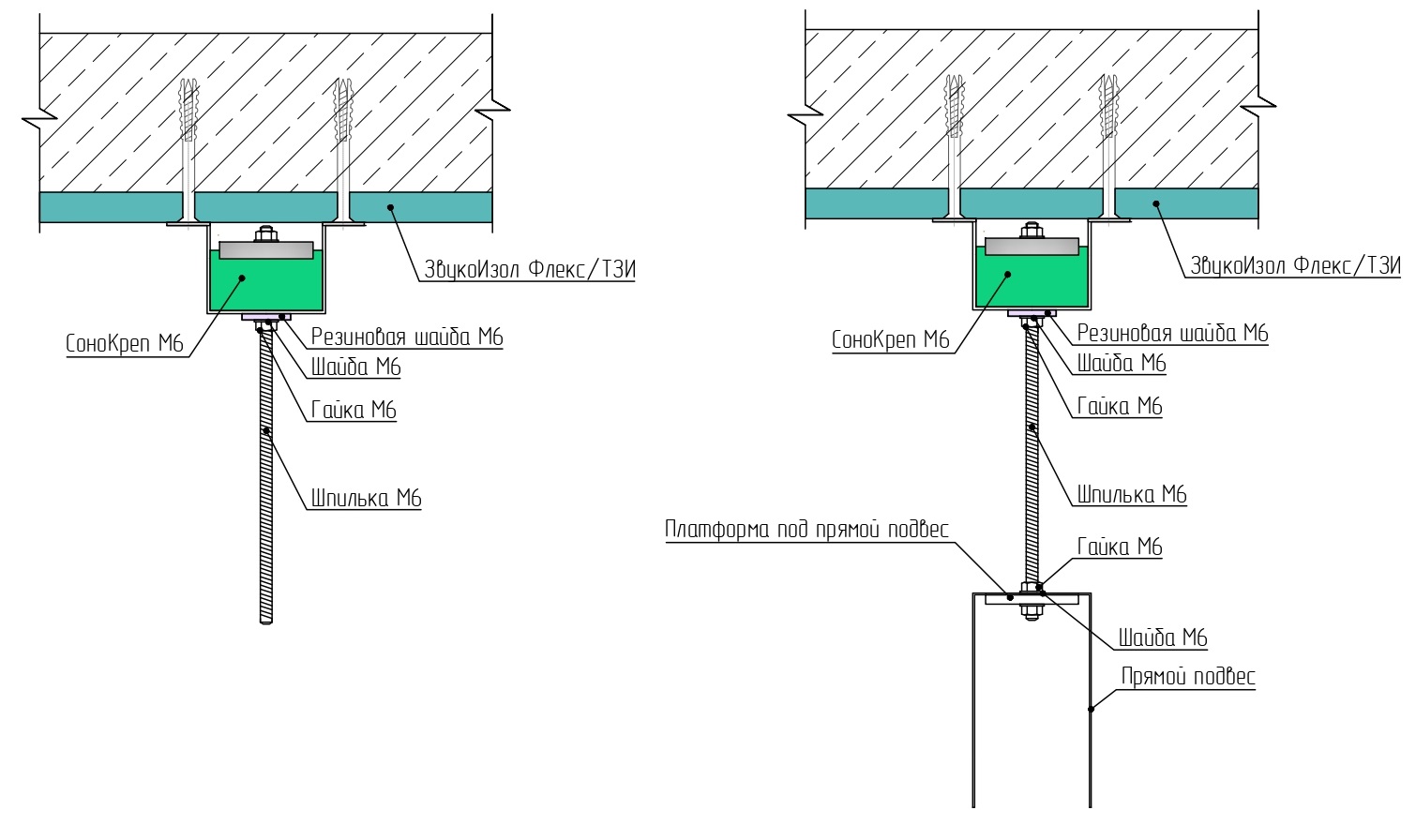 В качестве виброизолирующего элемента в подвесе используется материал Vibrafoam (Германия), уникальные свойства которого позволяют достичь более высоких показателей по виброизоляции, по сравнению с подвесами с резиновыми изоляторами. Для подвеса используются шпильки с резьбой М6.